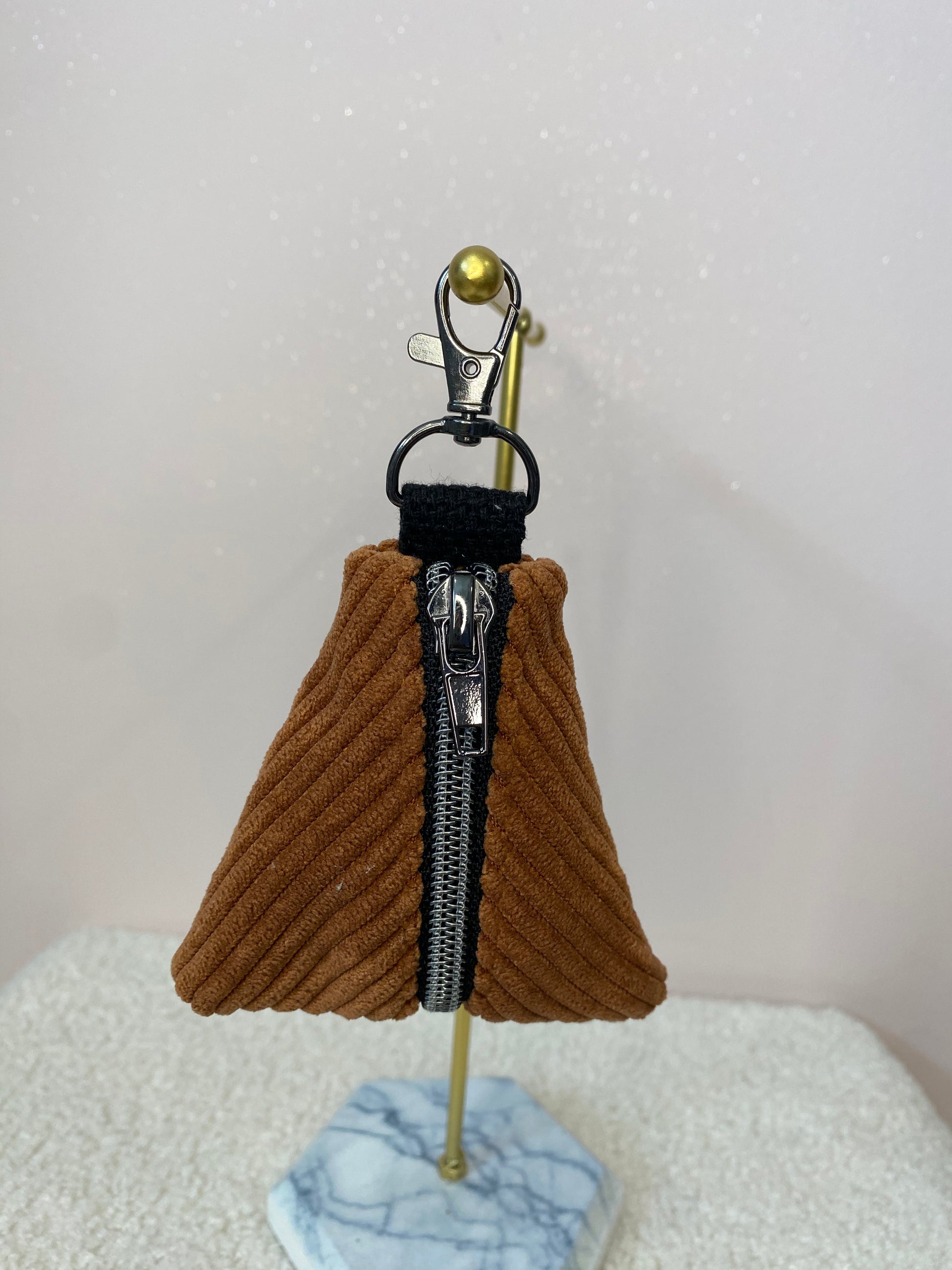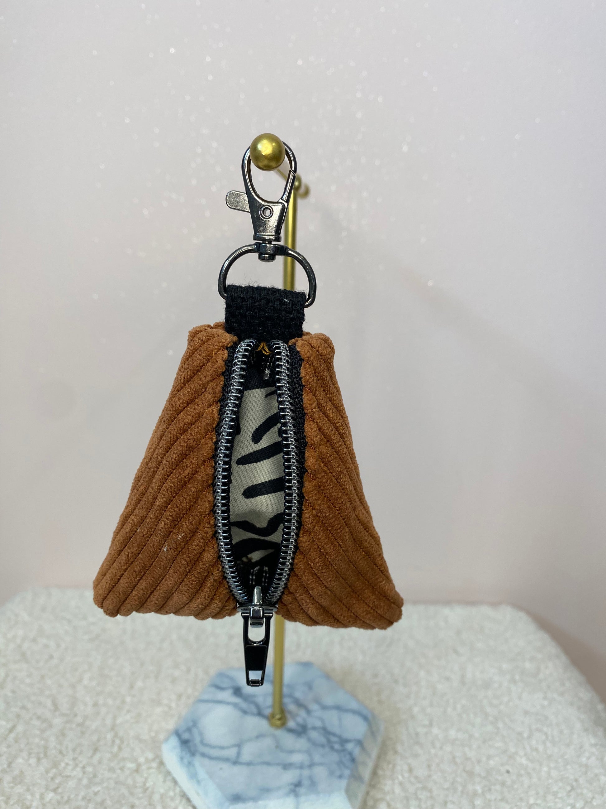 Matières : velours cotelé marron camel / intérieur noir et blanc / mousqueton argenté