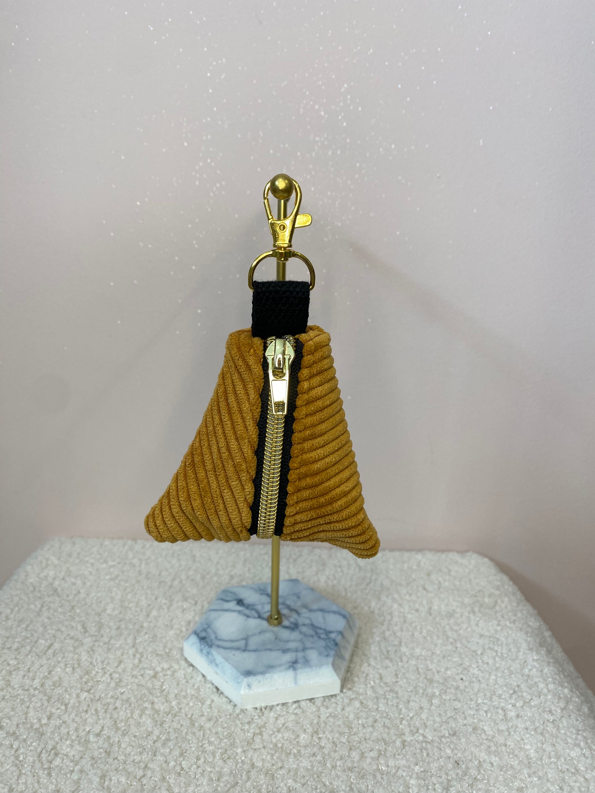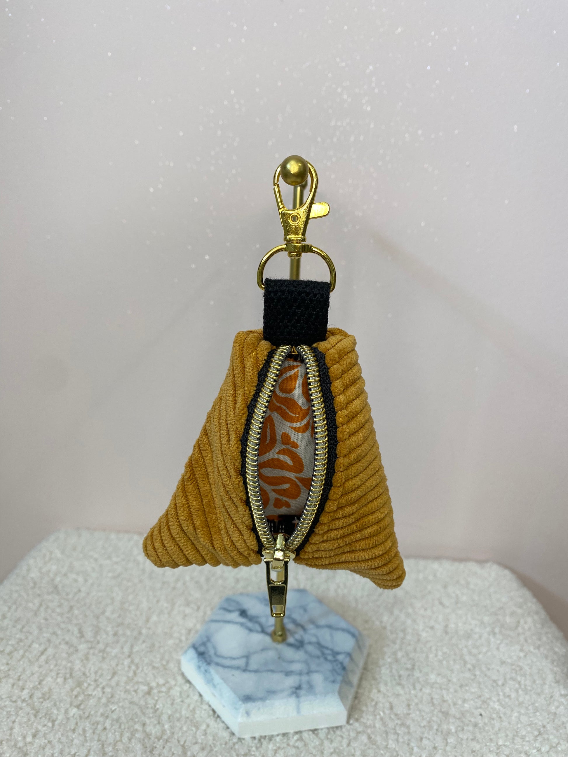 Matières : velours cotelé jaune moutarde / intérieur blanc et orange / mousqueton or
