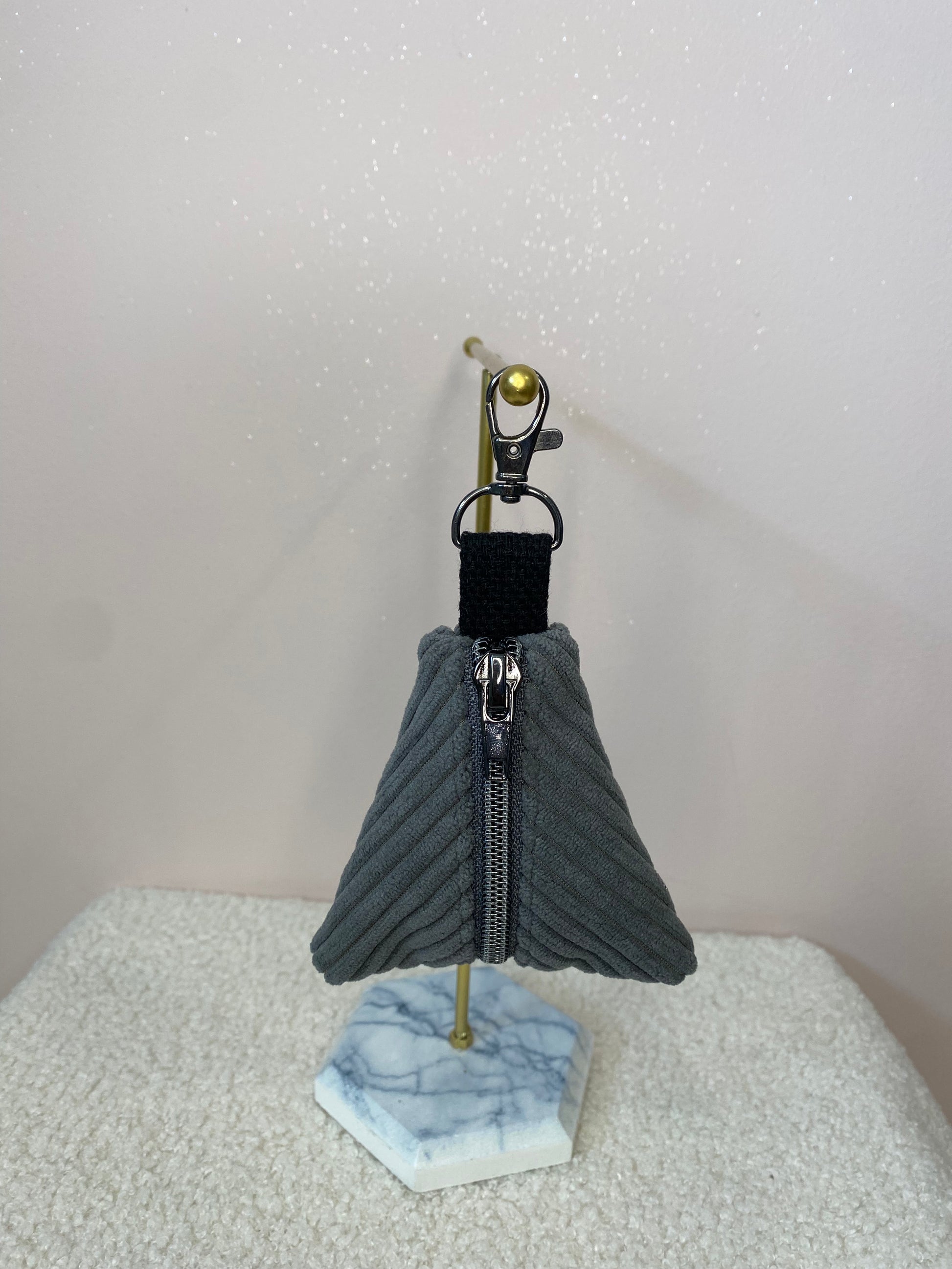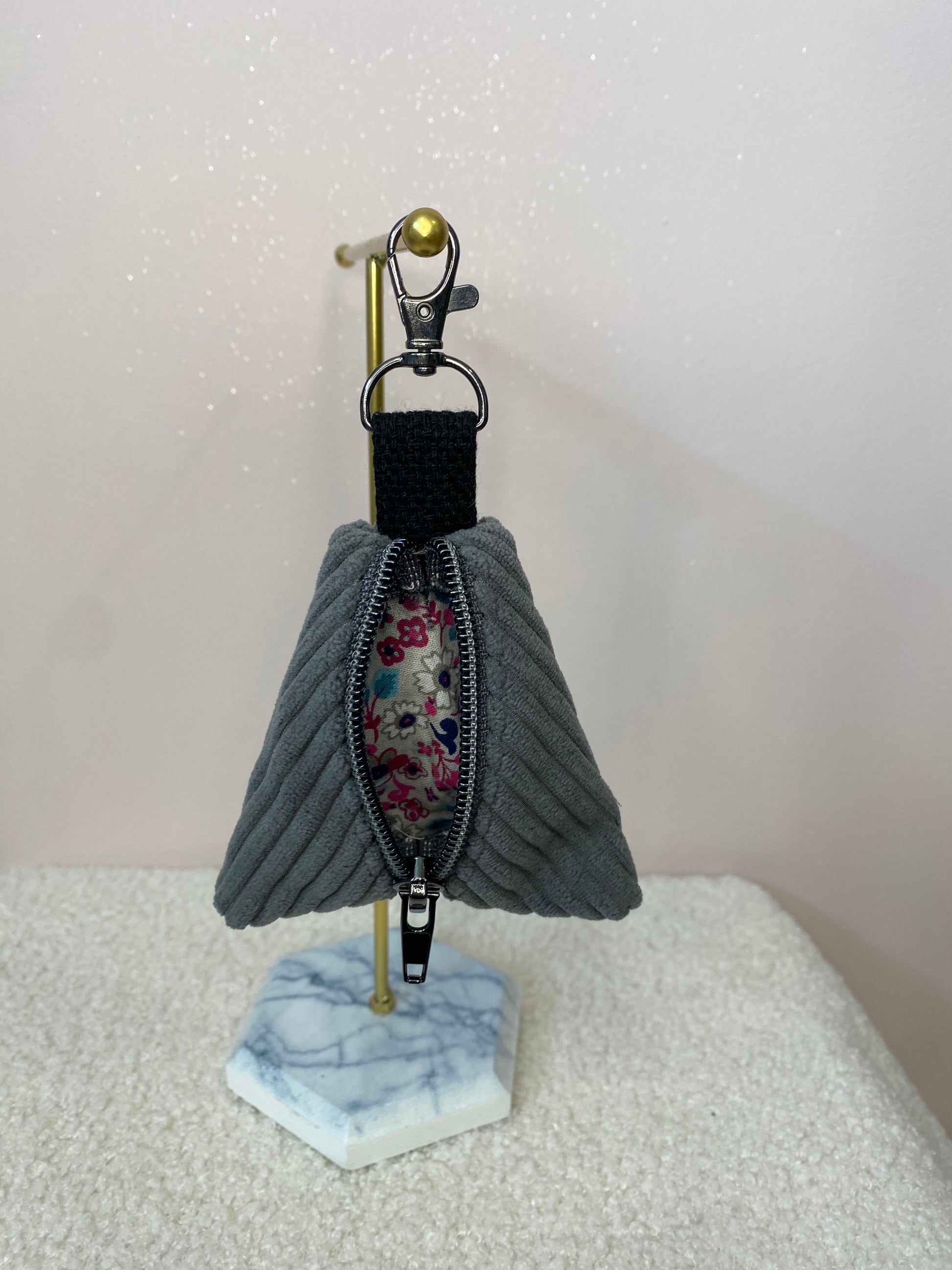 Matières : velours cotelé gris / intérieur fleuri / mousqueton noir