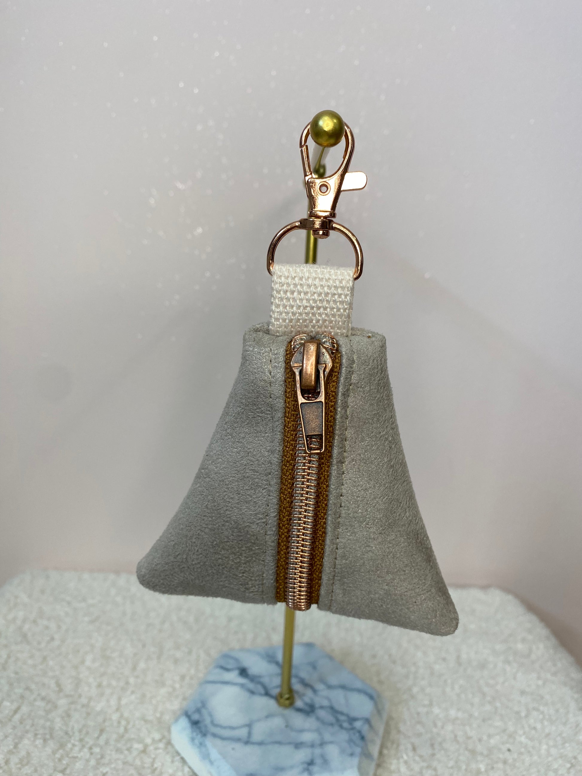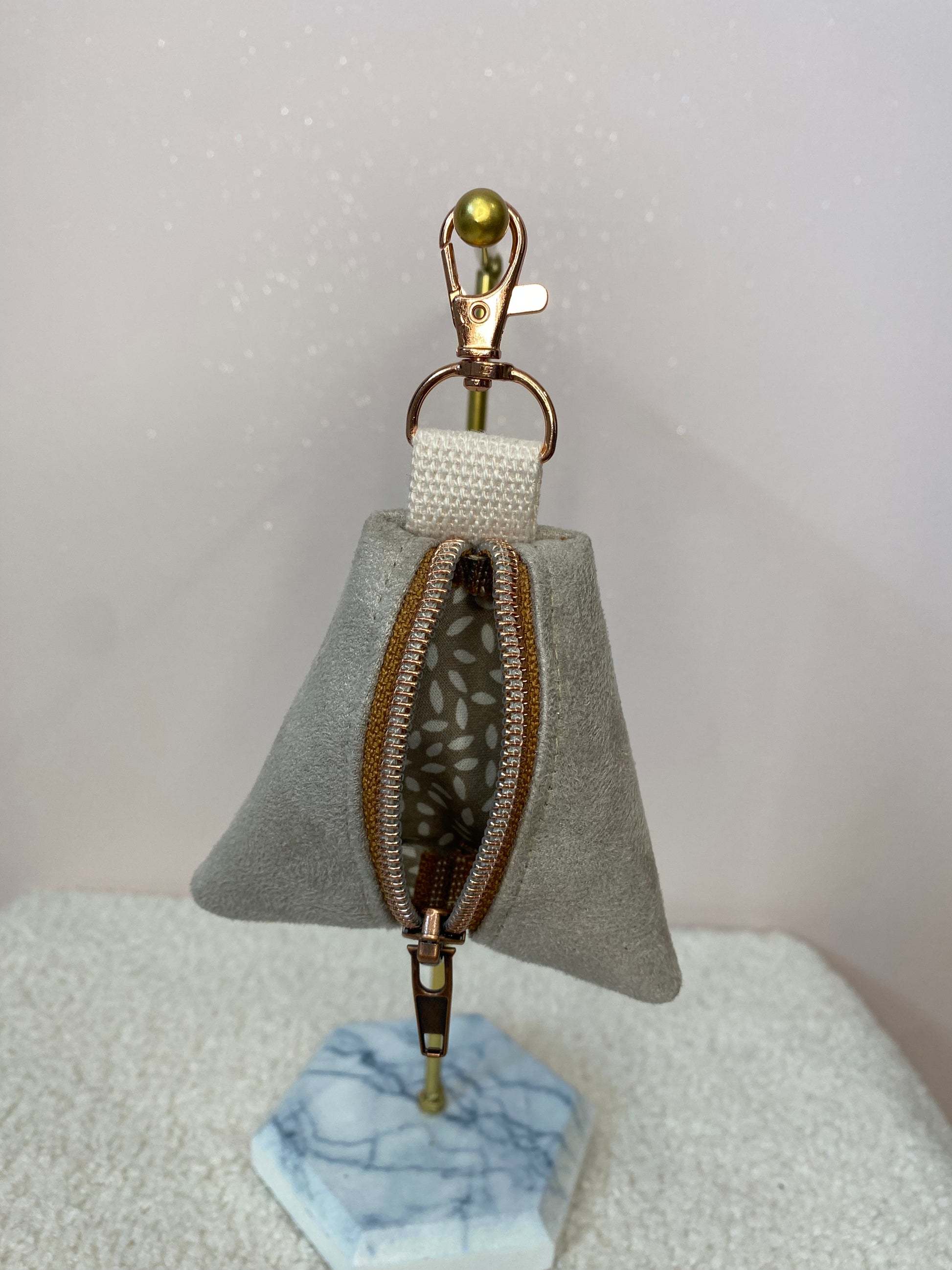 Matières : suédine taupe / intérieur taupe et blanc / mousqueton or doré
